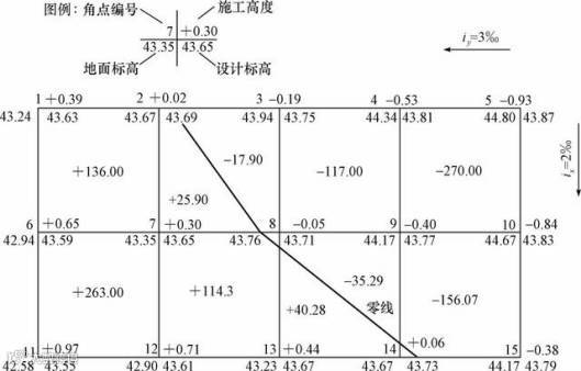 施工高度为场地各方格角点设计地面标高与自然地面标高之差,是以角点设计标高为基准的挖方或填方的施工高度。各方格角点的施工高度按下式计算:
