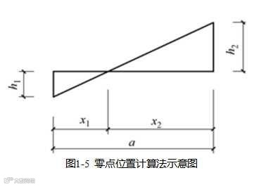方格边线一端施工标高为“+”,若另一端为“-”,则沿其边线必然有一处不挖不填的点,即“零点”,如图1-5所示。零点位置按下式计算: