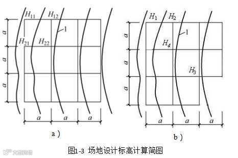 式中,H1、H2、H3、H4分别为一个方格、两个方格、三个方格、四个方格共用角点的标高(m),如图1-3b所示。