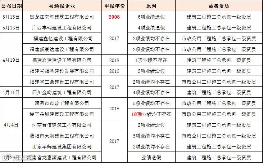 2019年前几个月,已有14家企业被通报,涉及55项业绩造假,均被住建部撤销一级资质。其中: