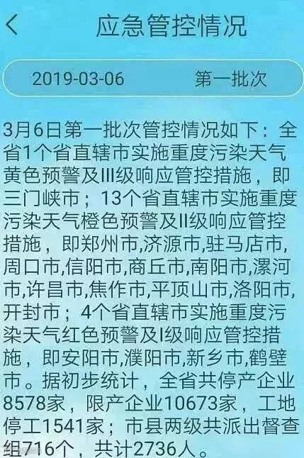 据初步统计,河南全省共停产企业8578家,限产企业10673家,工地停工1541家;市县两级共派出督查组716个,共计2736人。