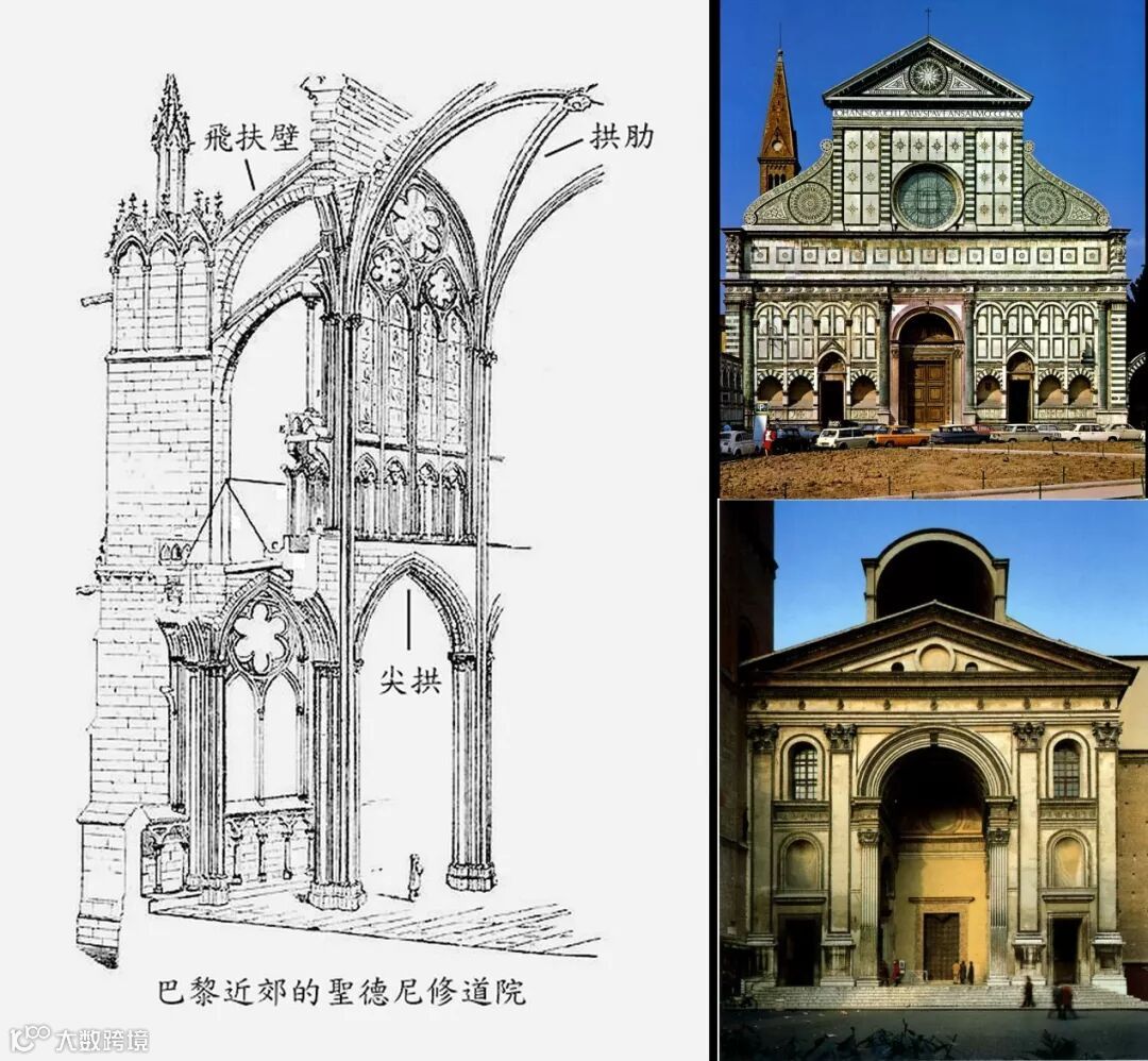 古希腊的神庙,威严地高耸在山地之上,让人能看出其庄重的柱,简单有力的结构形态(图1);古罗马建筑中,拱券和柱既是结构同时也体现着形式之美(图2);哥特建筑中,尖拱券的出现并不只是因为中世纪教皇权利集中的政治文化背景,其背后原因更包含着尖拱券受力的合理性(图3)。文艺复兴时期,建筑师成为独立的身份,不再附属于工匠或艺术家,关于建筑的讨论变得更加主动和深刻。文艺复兴时期的建筑师,将建筑中所有的要素都统一到同一个体系中,他们崇尚古典、和谐的比例关系,这使得他们要处理建筑从内到外所有要素之间的矛盾,建筑被整合成一个整体,不论是结构还是装饰,都要达到一种数的和谐秩序,融入进同一个有着和谐比例的体系之中。阿尔伯蒂作为文艺复兴时期早期的建筑师,致力于使建筑从内到外达到和谐统一的完美比例关系,从对圣母玛利亚教堂立面的探索(图4),到圣安德烈教堂中局部与整体所有要素的完美统筹(图5),阿尔伯蒂开创出了文艺复兴时期的一种标准的教堂形式。从艾森曼考证到阿尔伯蒂这里,建筑学第一次不止关注它的存在——制作法本身,还从内部和外部关注它的存在和表现法[1]。直到19世纪学科分离之前,结构与建筑绝大多数情况下是由建筑师统筹考虑的,正如阿尔伯蒂在论建筑中所表达的思想一般:“建筑物这一整件事情是由外形轮廓与结构所组成的[2]。”19世纪以来,建筑师们不断地探索结构与外在形式之间的关系,维奥莱·勒·迪克是结构理性主义,他崇尚哥特建筑中的结构美,认为建筑应遵循一整套视觉和内部结构相统一的逻辑系统。
