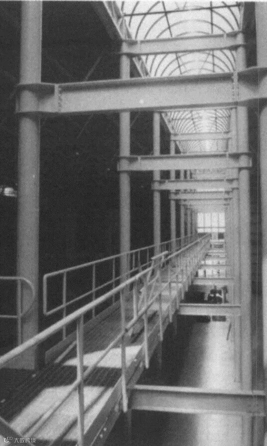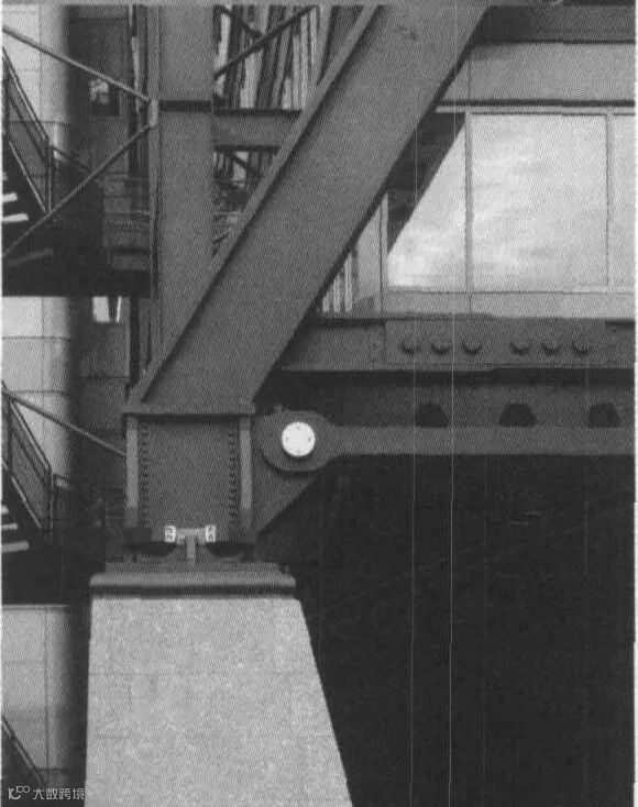 节点的设计可以成为内部空间塑造的重要形式,节点往往设计于结构的转折处,结构的转折通常会带来空间的变化,因此节点的设计对于空间的变换与界定有着重要意义。如雷诺中心中廊道的设计(见图20),在圆柱形钢管上套了单独设计的构件,完成工字形和圆形截面的结合,同时钢柱与横档共同界定出廊道空间。