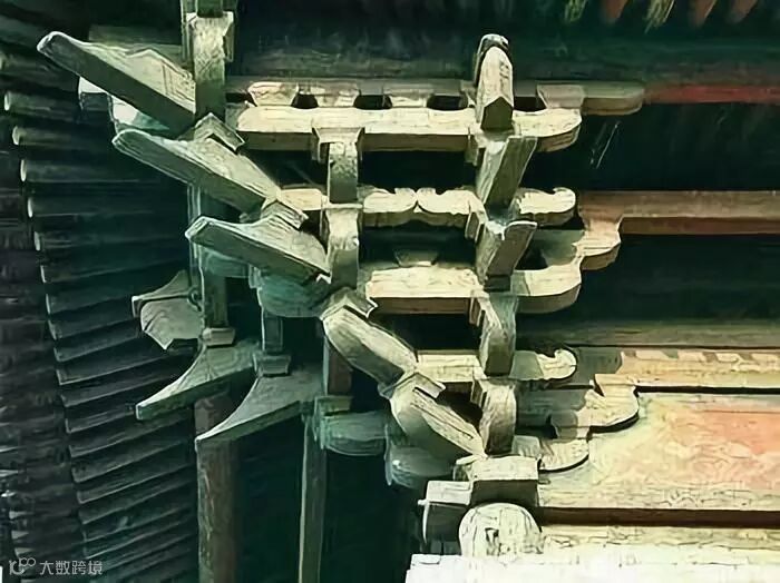 在传统木结构建筑中,斗拱就承担着节点这样一个重要角色(图8)。在清朝以前,斗拱是结构的一个重要组成部分,斗与拱层层相叠,连接屋顶、梁、柱,实现了力的传递,同时,它具有很强的装饰性,斗拱作为明露的结构,成为中国传统建筑中不可忽视的美学形式的组成部分,以至于到了清朝,虽已不需要斗拱作为承重构件,却依然没有取消这一结构构件。