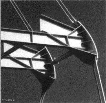 钢结构建筑中的节点根据其所起到的作用不同,大体可分为结构性节点和构造性节点。结构性节点是结构构件之间连接的节点,是建筑结构中力的集中点与传递点,起到完成各构件之间力的传递的作用,体现着各构件之间的稳定性和受力平衡,如:杆件与杆件之间的连接、索与索之间的连接、杆件与索之间的连接、构件与支座之间的连接等(如图11所示)。节点处的不同构件受力方式不同,拉力、压力、剪力等不同形式的力都反映在节点处,节点将这些力连接成一个整体,形成一个个视觉焦点,压力在节点处往往雄健有力,增加空间的力量感,而拉力则轻盈明快,给空间增添活跃感(如图12所示)。约翰内斯堡体育馆采用了一种悬挂结构,节点连接了拉索与平衡杆(如图13所示),节点处拉索通过平衡杆处的封板将拉力转化为压力,节点部位的加劲肋增加了节点的刚度和强度,实现了力的平衡。图中拉索显然承受很大的力的作用,维持受力平衡的节点显得强劲有力,体现出节点作为结构构件的力学美[4]。以同济大学B楼中庭大厅的屋顶为例(如图14所示),采用四角锥体系网架结构,支撑起大跨度空间的覆顶,采用螺栓球节点(如图15所示),具有节点部位没有偏心、受力状态好等优点。