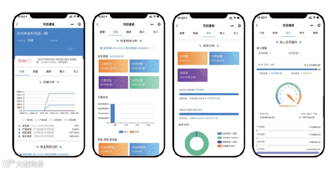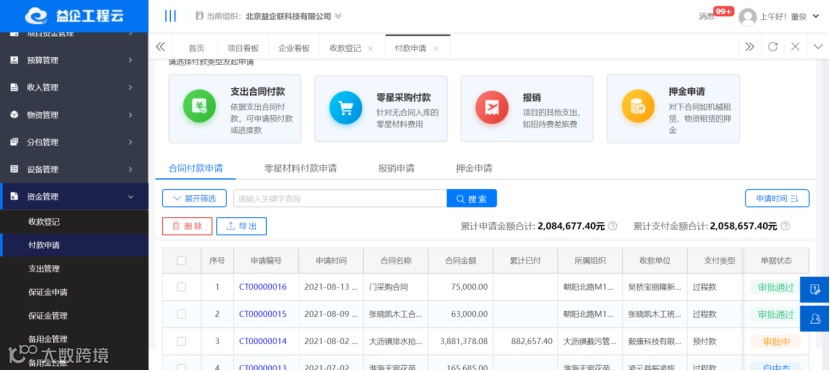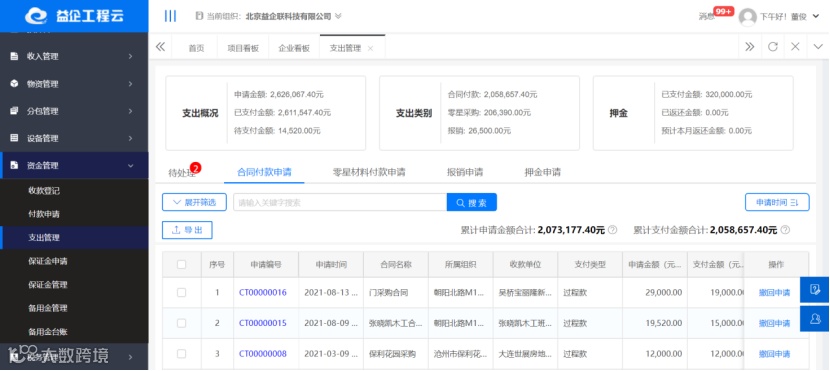 针对项目过程中涉及到的合同收入,合同款、报销款、备用金、保证金、押金的业务场景实现全面的线上管理。