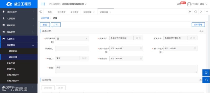 为了满足企业资质审验及工程投标的需要,益企工程云对各类证照、资质及个人证件实行统一管理和存放,登记证件名称、数量、批准时间、批准部门、证书经营范围、有效时间、年检时间;系统据此自动提示相应的年审、年检、换发、到期、过期等事宜;保证企业证件的及时性、连续性、有效性、安全性。
