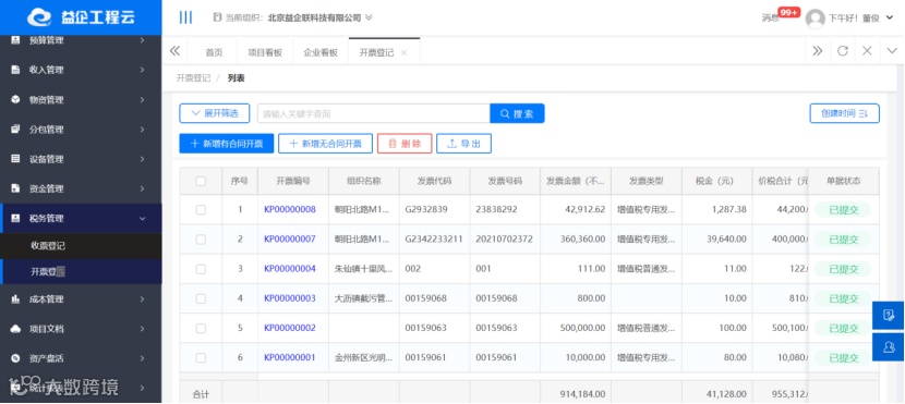 在益企工程云税务管理功能中对发票类型进行分类管理,比如劳务、材料、租赁、分包这几类,以后在进行各类型成本总额统计和开票情况统计时,可以在查询条件中直接输入相关类型即可,分类查询更加方便。