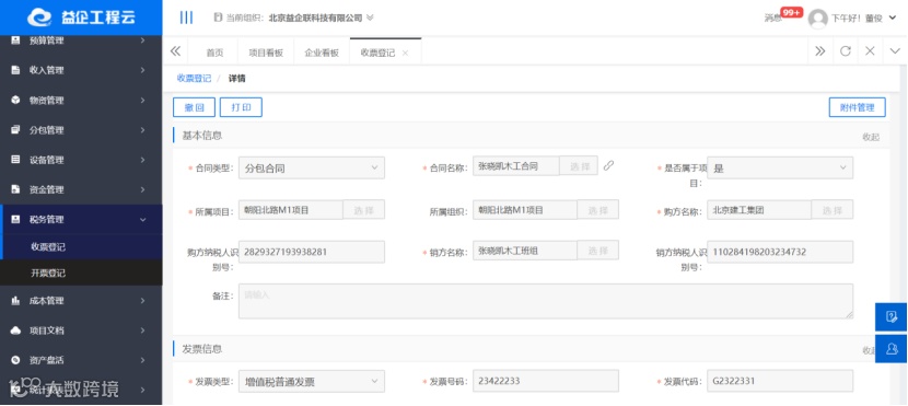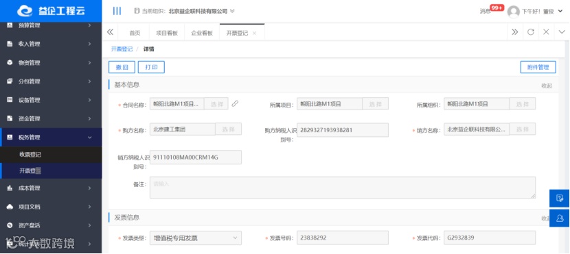 通过开票登记上的对应项目、合同、收票单位,可以明确的控制每一张发票的流向,开票既意味着收款,也意味着交税,因此控制好发票流向对于控制企业资金、成本有着重要的作用。
