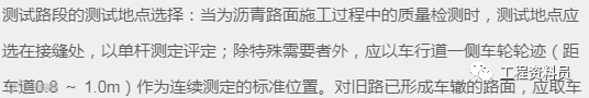 测试路段的地点选择:当为沥青路面施工过程中的质量检测时,测试地点根据需要决定;当为路面工程质量检查验收或进行路况评定需要时,通常以行车道一侧车轮轮迹带作为连续测定的标准位置。对旧路已形成车辙的路面,取一侧车辙中间位置为测定位置。