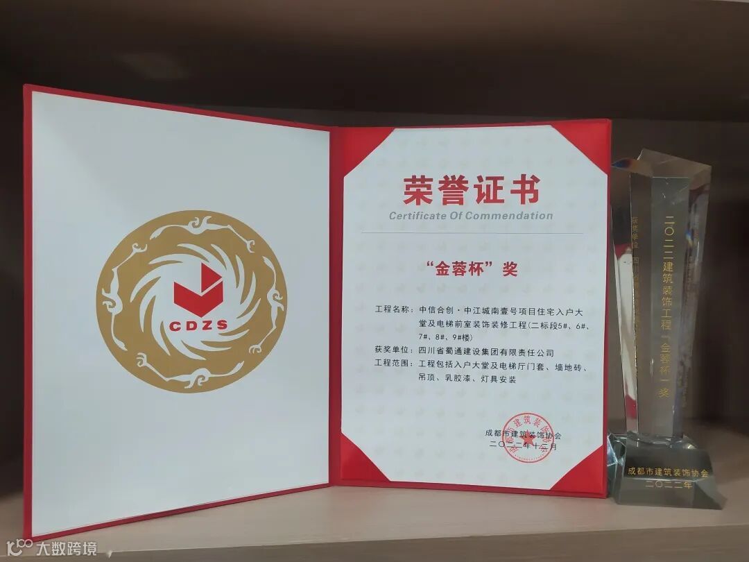 在2022年度成都建筑装饰工程“金蓉杯”颁奖典礼上,蜀通装饰承建的“中信合创·中江城南壹号项目住宅入户大堂及电梯前室装饰装修工程”项目,在众多参奖工程项目中脱颖而出,荣获成都建筑装饰工程“金蓉杯”奖,为2022年的工作画上了完美的句号。
