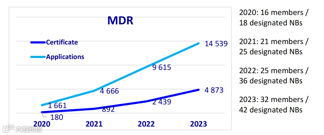 在过去几年中,欧盟医疗产品重新认证的主要挑战一直是公告机构是否有足够的能力来处理巨大的工作量。调查结果显示,对于MDR,2020年有18个公告机构获得指定,而到了2023年,这一数字增加到了42个。