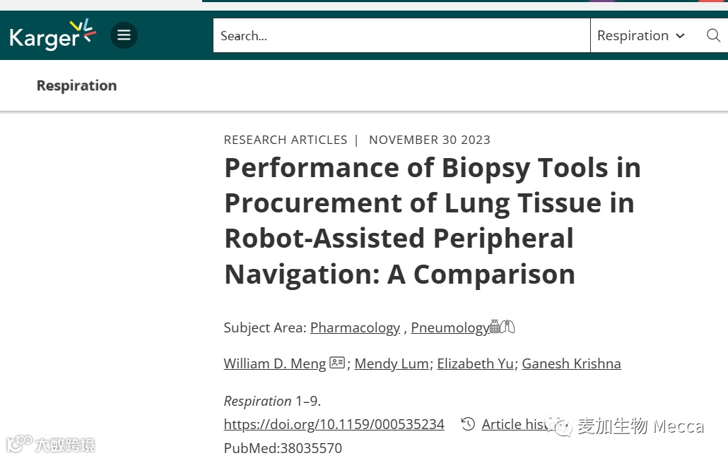 近日,Dr. Meng在权威的医学和生命科学领域国际出版社Karger发表了一篇关于机器人辅助导航支气管镜(RANB)技术在周围肺部病变(PPLs)活检中的应用的研究论文。Karger出版社总部位于瑞士巴塞尔,以其在生物医学和临床医学领域的高质量学术期刊和书籍出版而闻名。