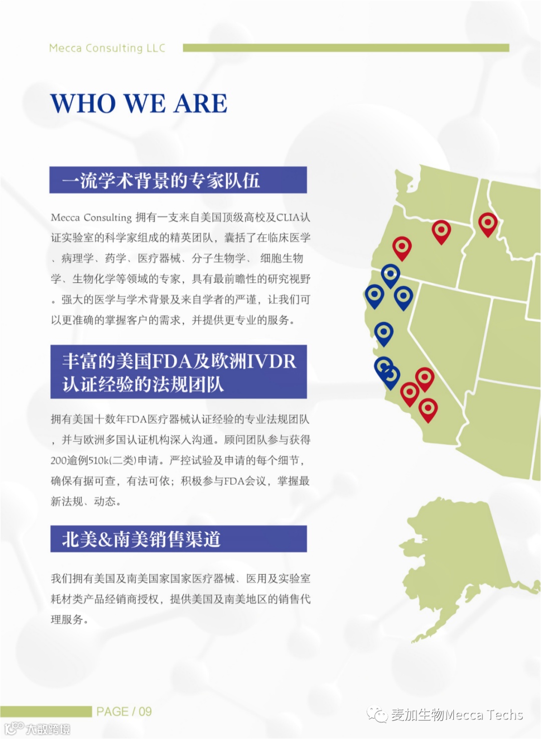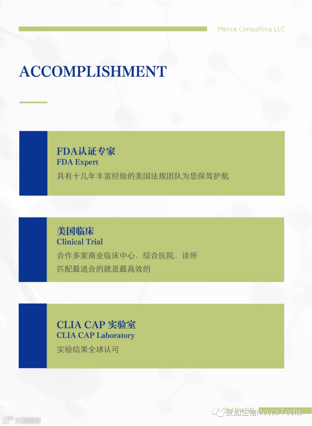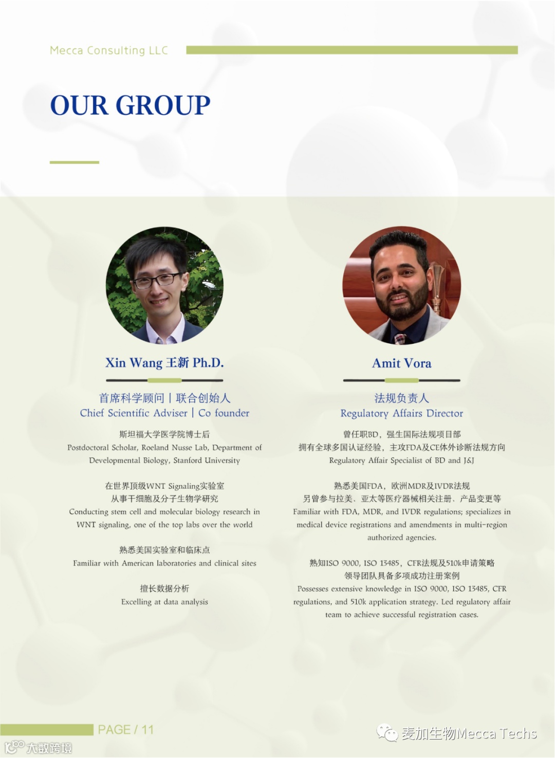Mecca Consulting LLC & Mecca Techs 拥有一支来自美国顶级高校及CLIA实验室的科学家组成的精英团队,囊括了在临床医学、医疗器械、分子生物学、细胞生物学、生物化学等领域的专家。同时,我们的法规团队拥有十年以上医疗器械及生物医疗合规从业经验,深谙FDA法规及运作模式。