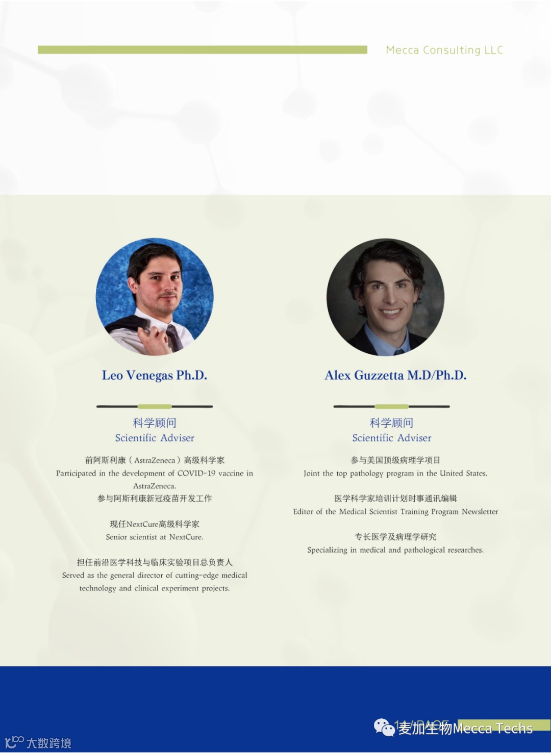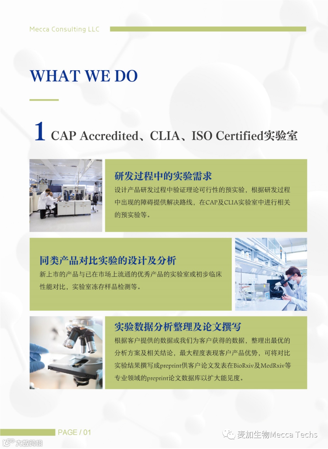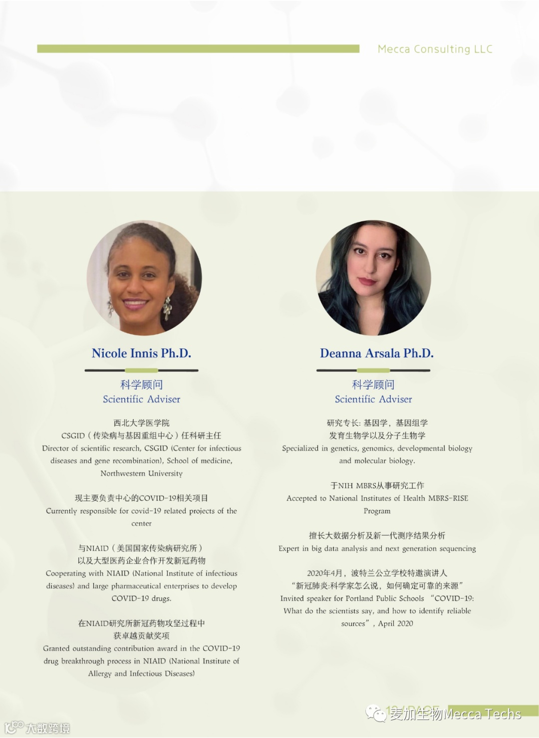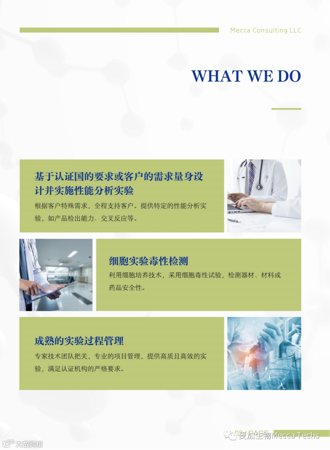 Mecca Consulting LLC & Mecca Techs 拥有一支来自美国顶级高校及CLIA实验室的科学家组成的精英团队,囊括了在临床医学、医疗器械、分子生物学、细胞生物学、生物化学等领域的专家。同时,我们的法规团队拥有十年以上医疗器械及生物医疗合规从业经验,深谙FDA法规及运作模式。