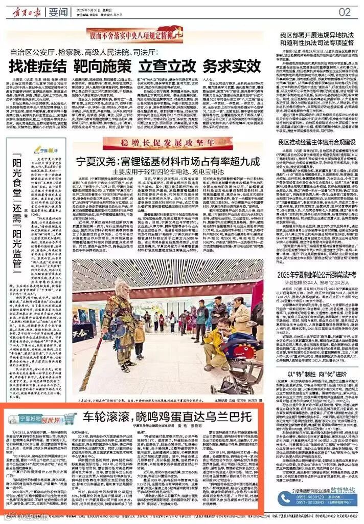 3月28日,永宁县闽宁镇宁夏晓鸣农牧股份有限公司(以下简称“晓鸣股份”)的大院内,一辆满载种蛋的冷链物流车缓缓驶出。随着车轮的转动,一场跨越国境的生命之旅正式开启。