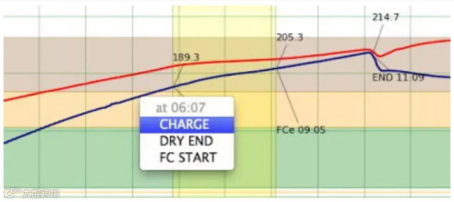 Artisan专注于记录您的烘焙。它使用来自仪表或手动输入的数据绘制温度曲线(使用这个神奇的设备“NONE”)。然而,烘焙曲线不仅与温度和时间有关。烘焙期间发生的重要事件可用于比较曲线。在“入豆”和“下豆”之间存在一个转折点 (回温点TP),即放入冷豆后导预热后的温度下降并再次开始上升。烘焙的其他关键事件是干燥阶段的结束 (DE) 、第一次和第二次爆裂的开始和结束,缩写为 FCs、FCe、SCs、SCe。这些关键事件可以通过在烘焙过程中按下相应的按钮来记录。