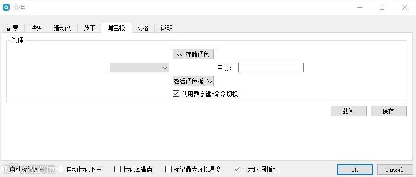 按钮和滑块配置可以存储在 10个调色板中的1个里,并从其中加载。事件对话框的“调色板”选项卡允许您将相应的配置“转移到”和“恢复自”到选定的调色板,以及将所有调色板数据存储到磁盘上的文件中并重新加载它。激活一个调色板配置的最快方法是在主窗口处于活动状态时按数字键 0-9。