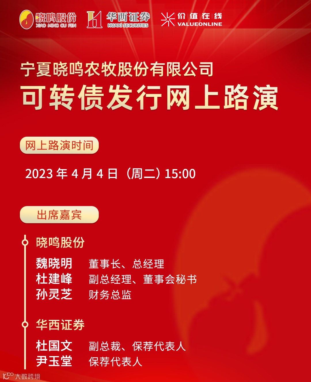 导读:活动预告宁夏晓鸣农牧股份有限公司将于2023年4月4日(周二)15:00-17:00举行可转债发行的网上路演