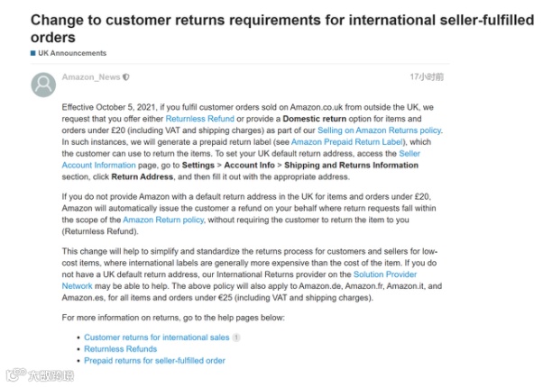 不管卖家你是在外游玩还是返程,或已经回到工作岗位,都要注意的是,此前亚马逊欧洲站发布“国际卖家自配送订单的客户退货要求变更”公告,已于10月5日生效。