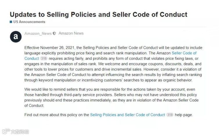 自2021年11月26日起,将更新销售政策和卖家行为准则,在公告中,亚马逊明确禁止操纵搜索排名和任何形式的价格垄断行为。亚马逊卖家行为准则要求公平行事,并禁止以任何形式违反价格垄断法,以及操纵销售排名的行为。