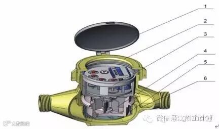 1-表盖;2-罩子;3-计数机构;4-叶轮计量机构;5-碗状滤丝网;6-表壳