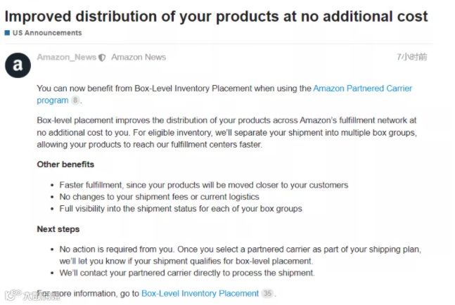 日前,亚马逊美国站发布公告称,使用亚马逊合作承运人计划的卖家现在可以享受“Box-Level ”库存放置服务,不需要支付其他的费用。
