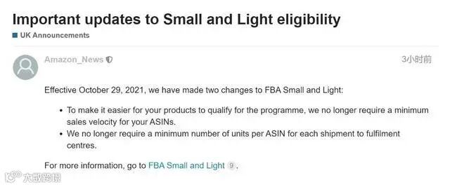 日前,亚马逊美国站和欧洲站同时发布公告称,自10月29日起,亚马逊物流轻小商品计划进行了两项更改,内容如下:
