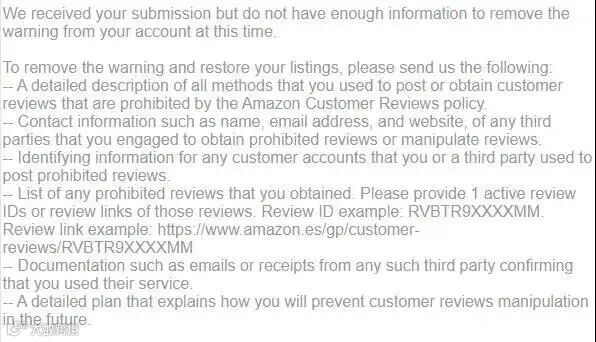 卖家称,自己收到了亚马逊的刷单警告邮件,并且店铺listing被下架了。邮件表示其下架原因为刷单,若要删除警告并恢复listing,请发送以下内容: