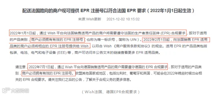 12月2日,wish要求:自2022年1月1日起,通过wish平台向法国销售适用产品的商户将需要遵守法国的生产者责任延伸(EPR)合规要求。即对于产品适用的类别,商户必须拥有有效的EPR注册号(也称为唯一标识号,UIN)。