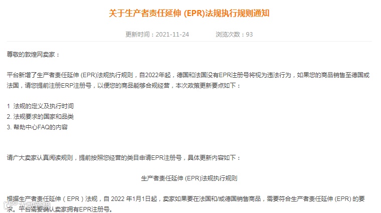 11月24日,敦煌网发布要求:自2022年起,商品销售至德国和法国没有EPR注册号将视为违法。