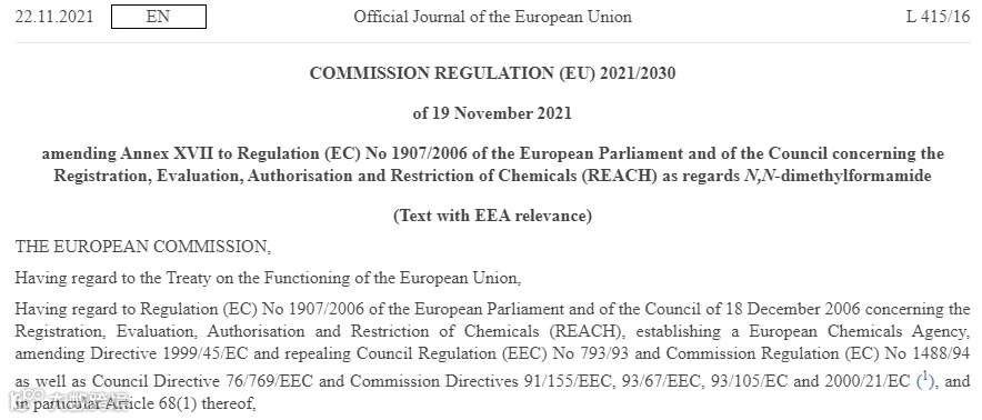 2021年11月22日,欧盟在其官方公报上发布(EU)2021/2030法规,新增REACH法规附录XVII第76项关于N,N-二甲基甲酰胺的限制条款,正式将N,N-二甲基甲酰胺纳入REACH法规限制清单。法规将在欧盟官方公报上公布之日起第20天生效(12月12日)。