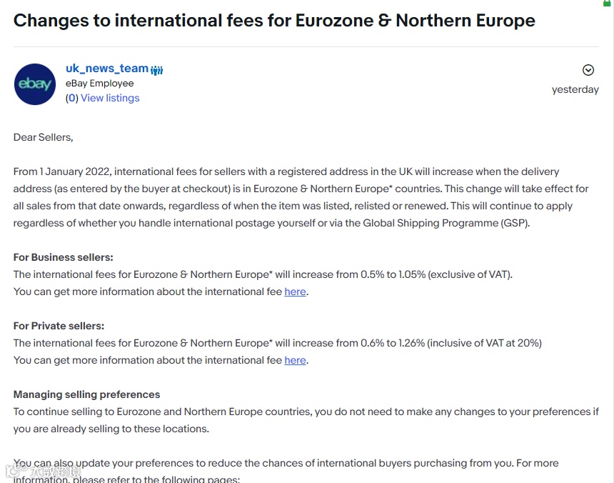 日前,eBay发布新的公告称,从2022年1月1日起,当收货地址(由买方在结账时输入)在欧元区和北欧国家时,注册地址在英国的卖家的国家费用将增加。