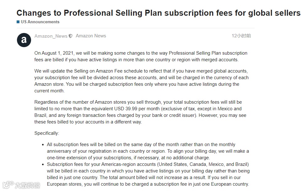 从2021年8月1日开始,它将向每个国家的卖家收取费用,但总订阅费用仍将被限制在每月不超过相当于39.99美元的水平。