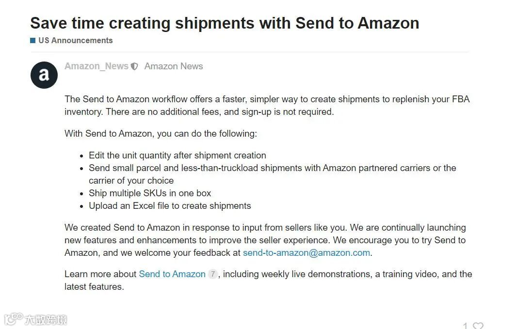 与此同时,亚马逊美国站此前还发布一则新公告,表示将使用Send to Amazon来节省创建货件的时间