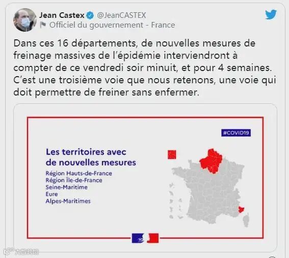 据外媒报道,欧盟目前的感染率,处于2月初以来的最高水平,法国、意大利、德国和波兰的感染率呈直线上升。就在上周四,法国总理让·卡斯特克斯(Jean Castex)宣布:20日起,包括巴黎在内的16省实行“封城”一个月。