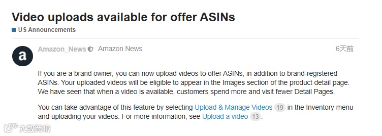 除此之外,品牌卖家也有福利,如果卖家是品牌所有者,那么除了品牌注册的ASIN之外,现在还可以上传视频以提供ASIN。