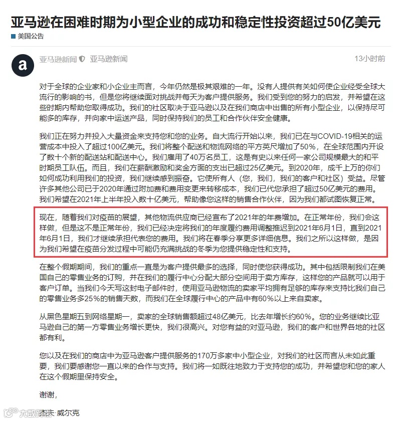 12月22日,亚马逊发布的最新公告表示,将推迟上调卖家的仓储和运输费用,直到2021年6月,并适用于美国、欧洲和日本的卖家。