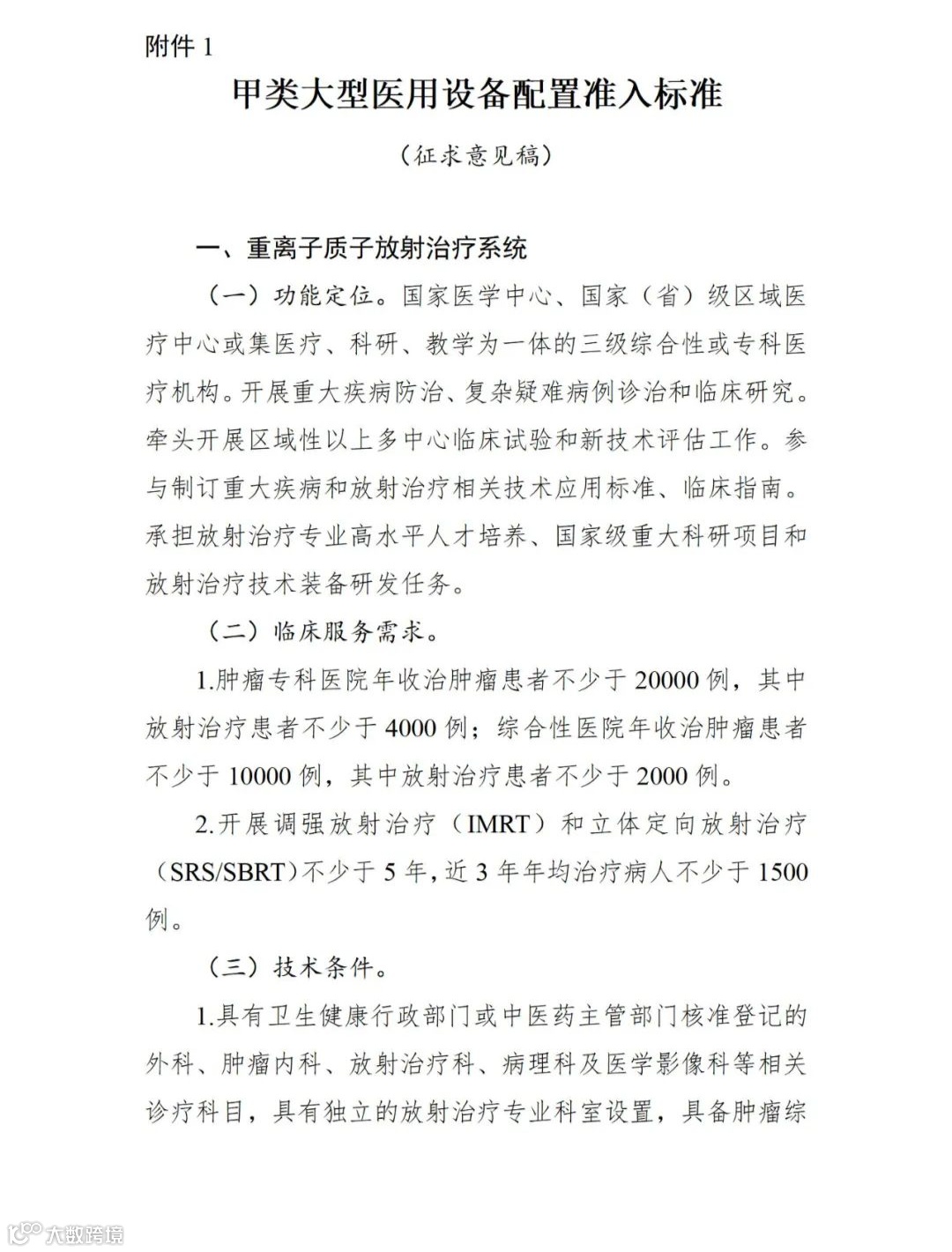 根据《甲类大型医用设备配置准入标准(征求意见稿)》,此次修订集中在重离子质子放射治疗系统和高端放射治疗类设备这两部分。