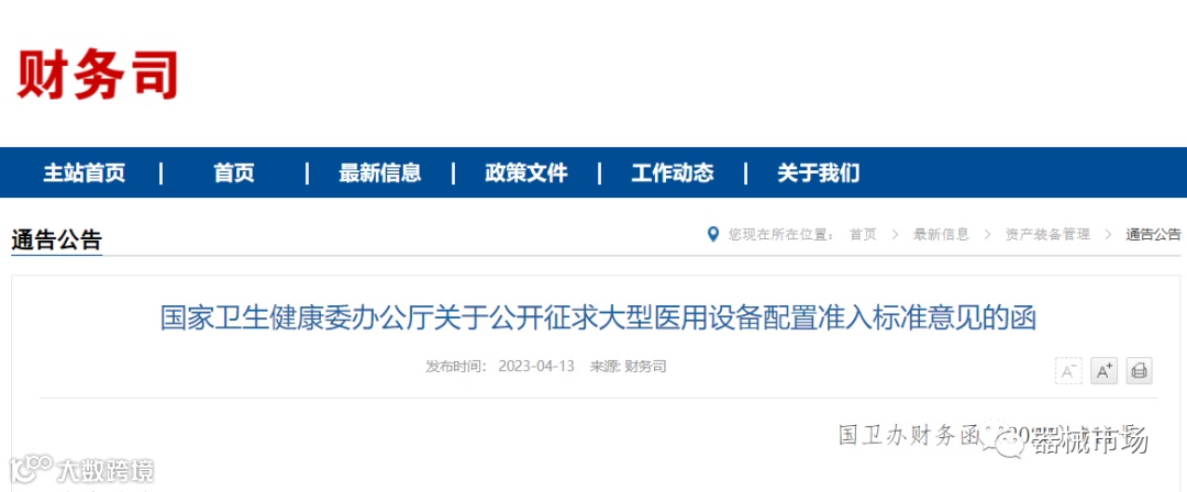 2023年4月13日(今日),中国政府网发布《国家卫生健康委办公厅关于公开征求大型医用设备配置准入标准意见的函》(以下简称《征求意见函》)