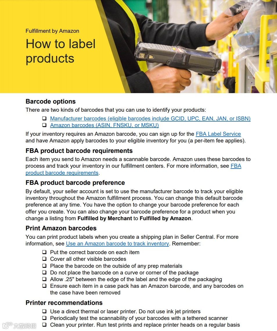 卖家要想了解如何自行打印和粘贴条形码,请下载如何为商品贴标。您还可以注册亚马逊物流贴标服务,让亚马逊为您贴标。