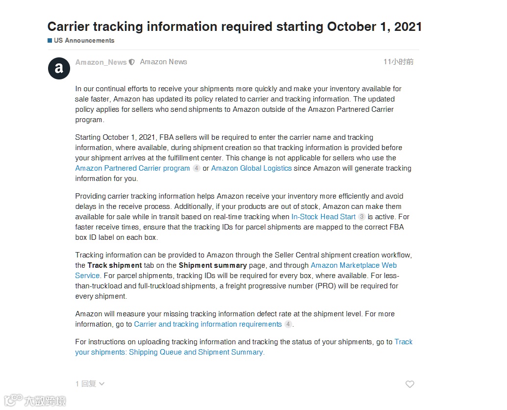 8月17日,亚马逊美国站发布公告称,从2021年10月1日起自配送卖家需提供承运人物流追踪信息。