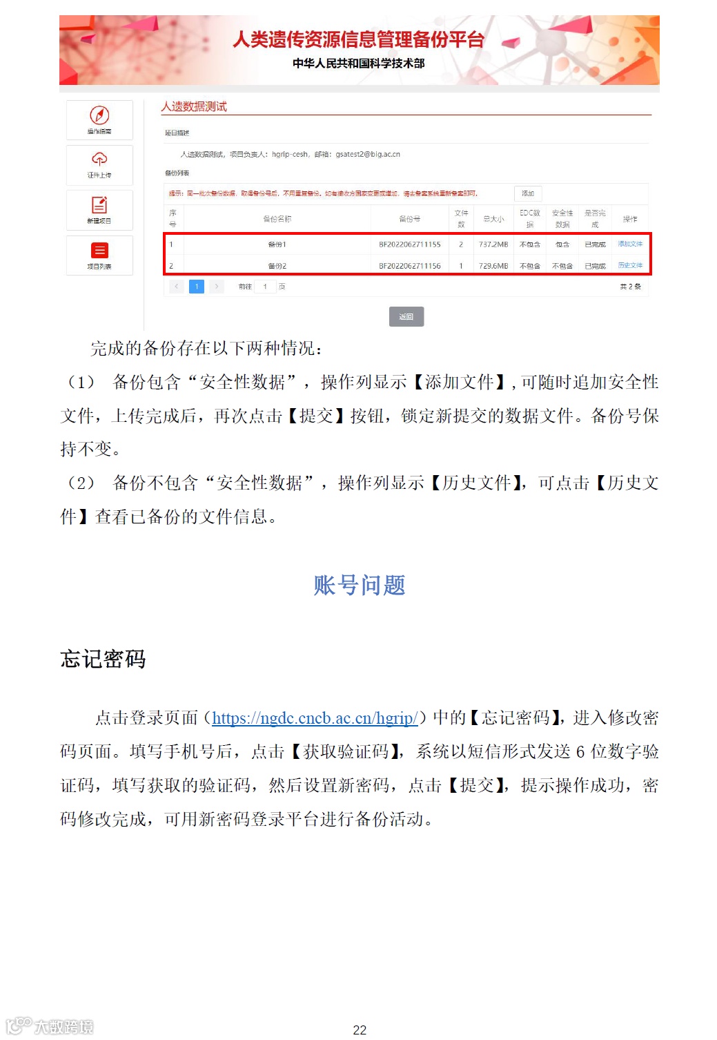根据2022年7月11号中国人类遗传资源管理办公室发布的公告,原“人类遗传资源信息备份平台”将更名为“人类遗传资源信息管理备份平台”,新平台将整合人类遗传资源信息管理、备份、发布与共享等功能,实现人类遗传资源信息一体化服务。