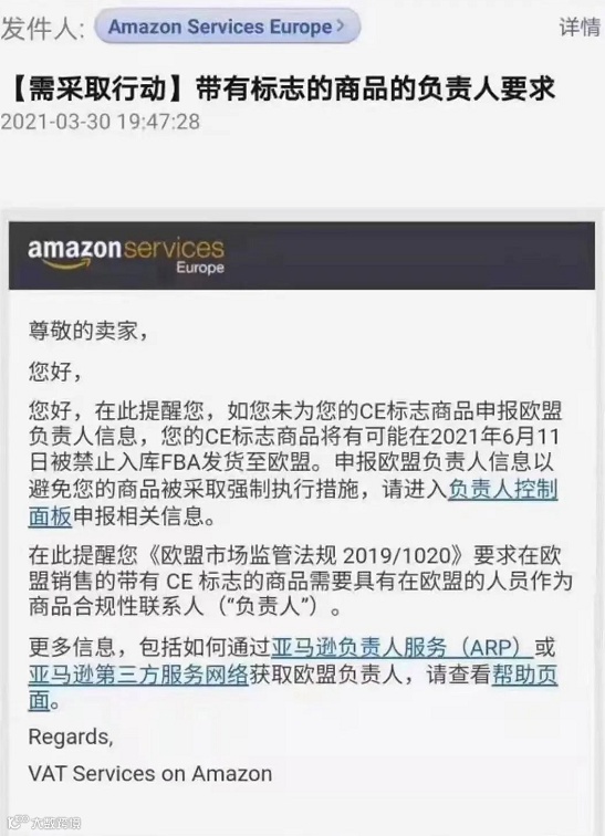 但总有卖家不重视,觉得时间还很充足,先不急着注册欧代,再等等。这部分的卖家要注意了!现在已经有卖家收到了亚马逊的邮件,在6月11日之后,属于CE认证的产品没有欧代的话,将会被禁止入库FBA发货至欧盟,要求卖家上传欧代信息!!!