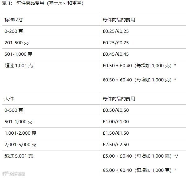 1、每件商品费用(基于尺寸和重量)(英国/欧盟:表 1)
