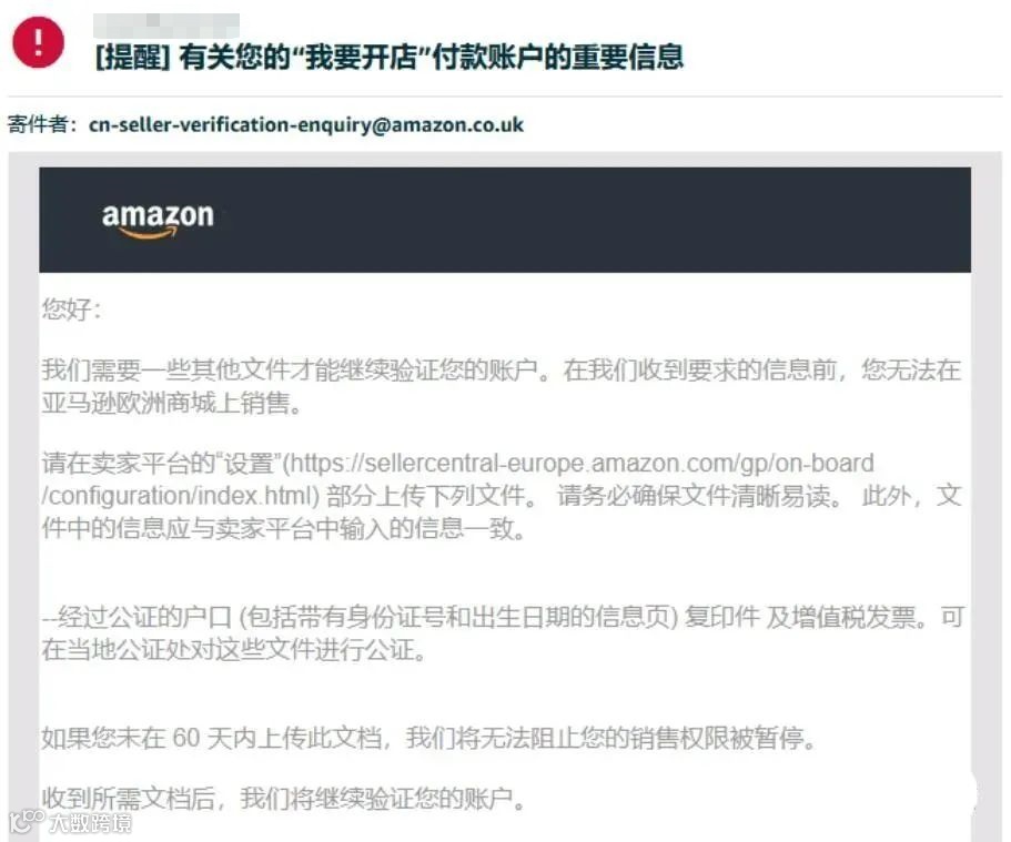 遭遇KYC审核的新账户,首先会收到一封亚马逊官方发来的邮件通知: