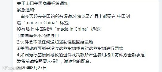 据悉,从8月26日起,发往美国去的所有货物,包装外箱及产品都需要贴上“made in china”的原产地标签,否则美国海关将不允许其进口。并将不会进行任何通知就把快件强制性退回始发地或是对这些快件进行罚款,所有损失将由寄件方全额承担。