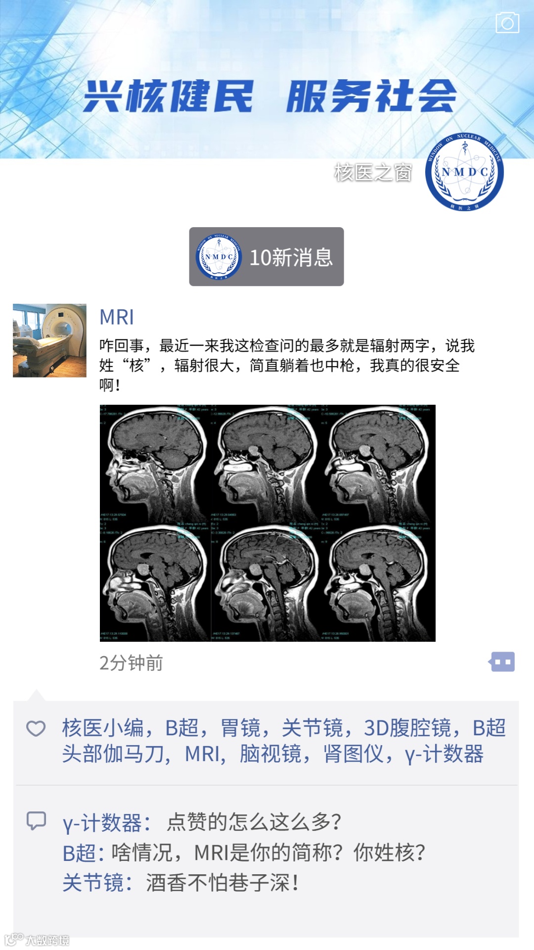 MRI, 专业称呼为核磁共振,顾名思义,它的仪器是一块大磁铁,相当于用手机摇一摇,让人体中的氢质子振动起来,再平静下来,感受一下里面的振动。其主要用于发现软组织疾病,在骨科主要用于发现椎间盘病变、脊髓病变、半月板病变、炎性病变和出血性病变等。很多的软组织只有核磁才可以更好地显示,神经、肌肉、脂肪在核磁图像上一清二楚。