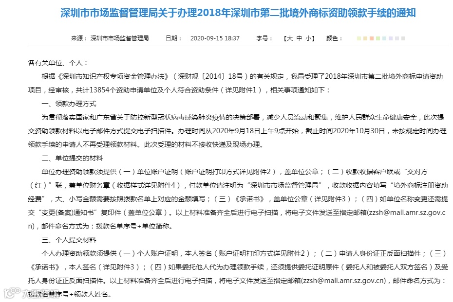 9月15日,深圳市市场监督管理局发布了“关于办理2018年深圳市第二批境外商标资助领款手续的通知”,对外公布2018年深圳市第二批境外商标资助拨款名单,共计13854个资助申请单位及个人符合资助条件,最高金额高达47万!可谓是羡煞旁人!
