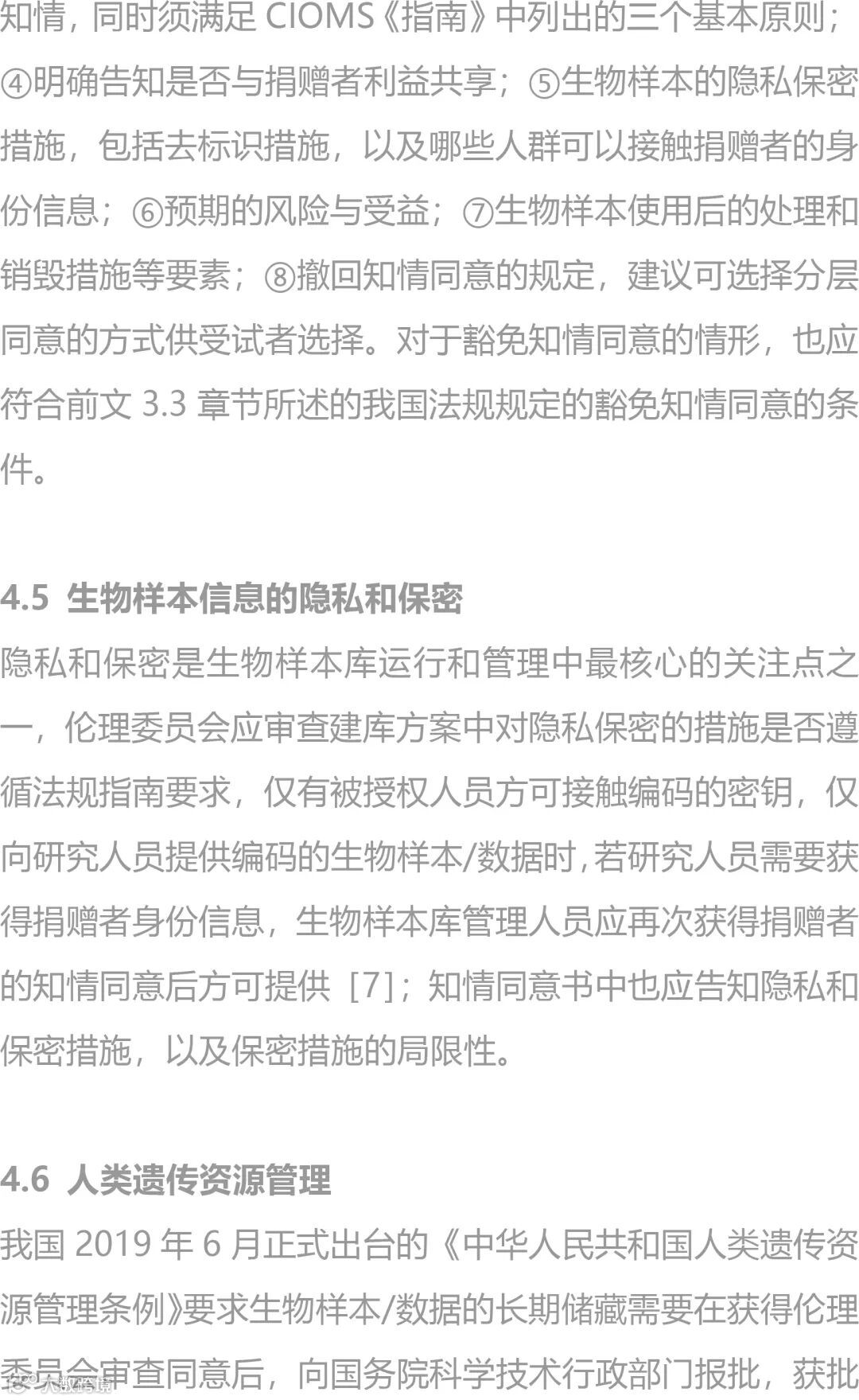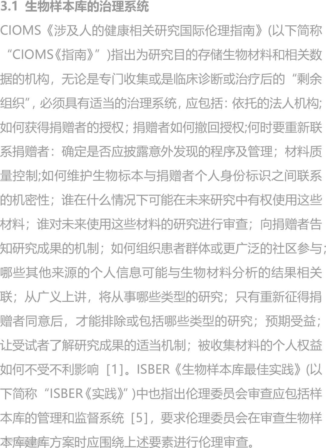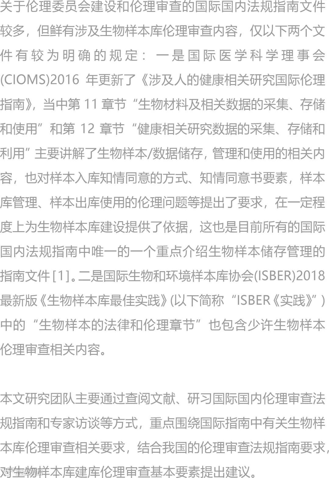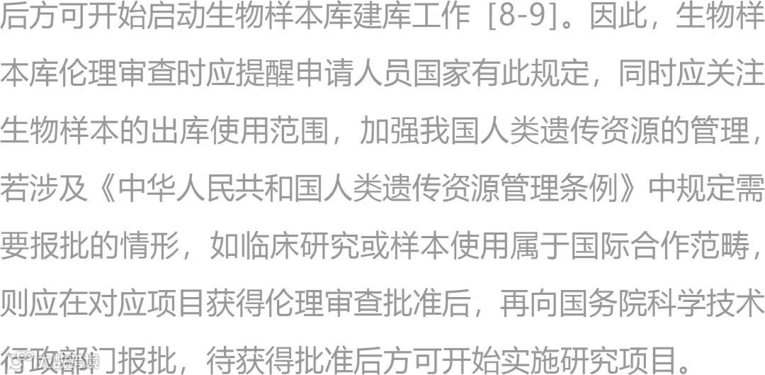 “ 随着近年来生物医学的迅猛发展和转化医学、精准医学概念的不断深入,生物样本库建设越来越受到广泛关注和投入。涉及人体的生物材料包括:组织、器官、血液、血浆、皮肤、血清、DNA、RNA、蛋白质、细胞、毛发、指甲、尿液、唾液或其他体液等,相关人员出于研究或医学或诊断目的收集上述材料[1],有些材料在收集时不知道确切的研究项目和具体用途,于是组建生物样本库,将生物样本/数据通过一定的技术手段进行储存,期望能用于将来的研究。《赫尔辛基宣言》第一条即写明:作为对涉及人体受试者的医学研究的伦理原则的一项声明,此研究还包括对可识别身份的人体材料和数据进行的研究[2],因此生物样本库的建库必须获得伦理委员会审查批准。”